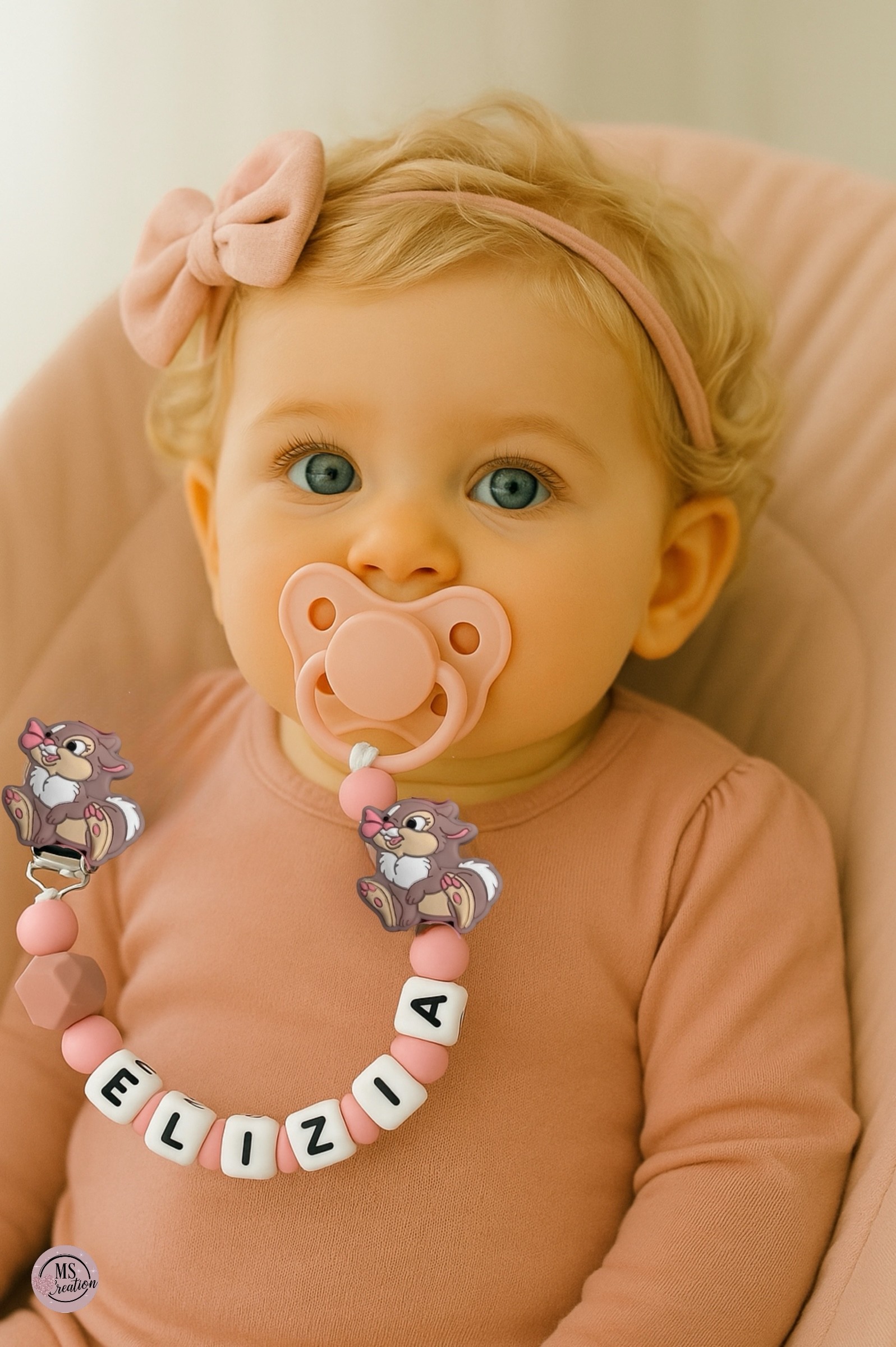 Chaque attache est personnalisée avec le prénom de votre choix, dans un joli mélange de perles en silicone alimentaire aux teintes douces (rose poudré, blanc, beige…).