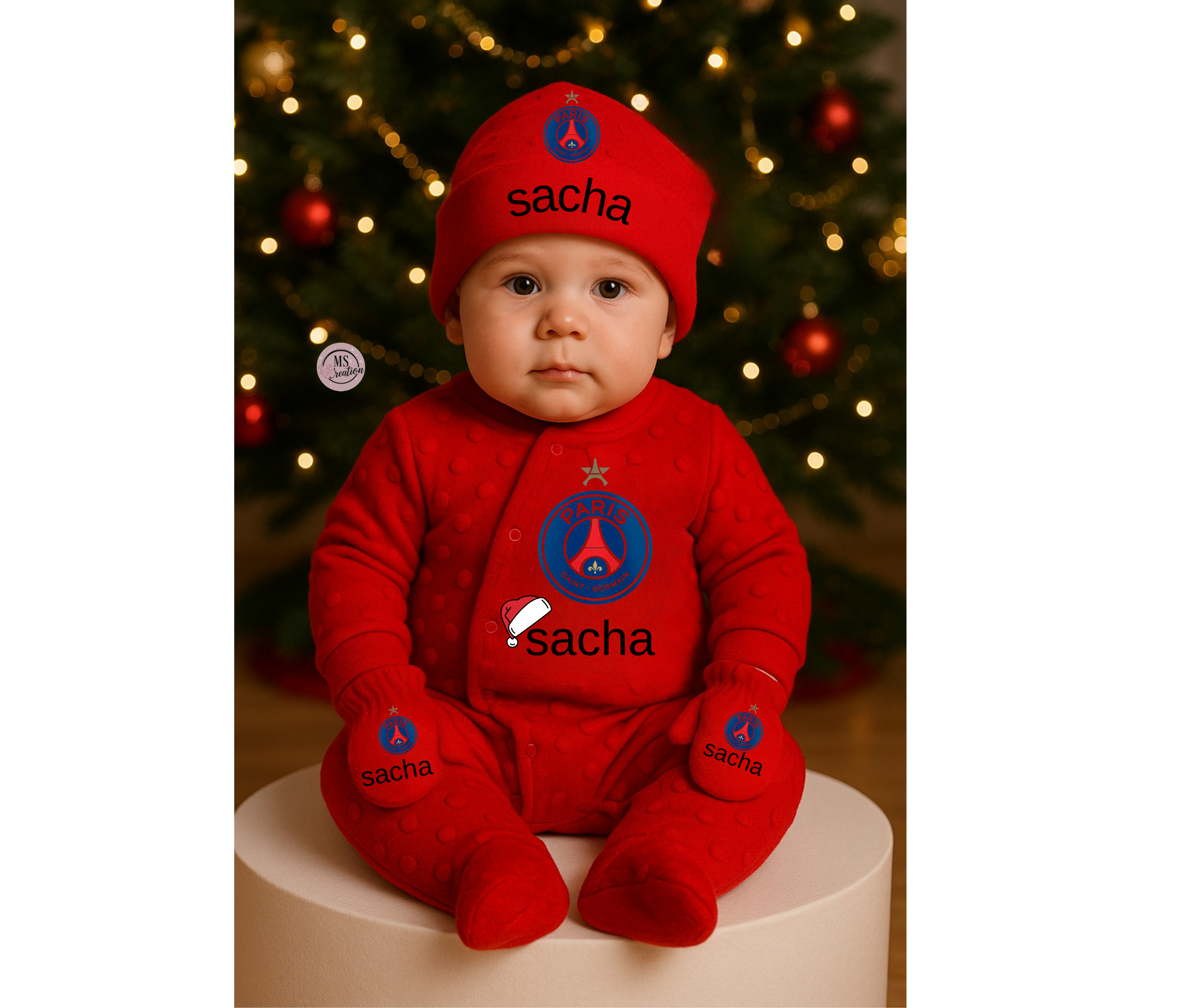 Pour personnaliser davantage cet ensemble festif, vous avez la possibilité d’ajouter un **bavoir** et un **body** assortis, tous deux personnalisables avec le motif et le prénom de votre choix 🌟. Parfait pour des moments inoubliables en famille autour du sapin !