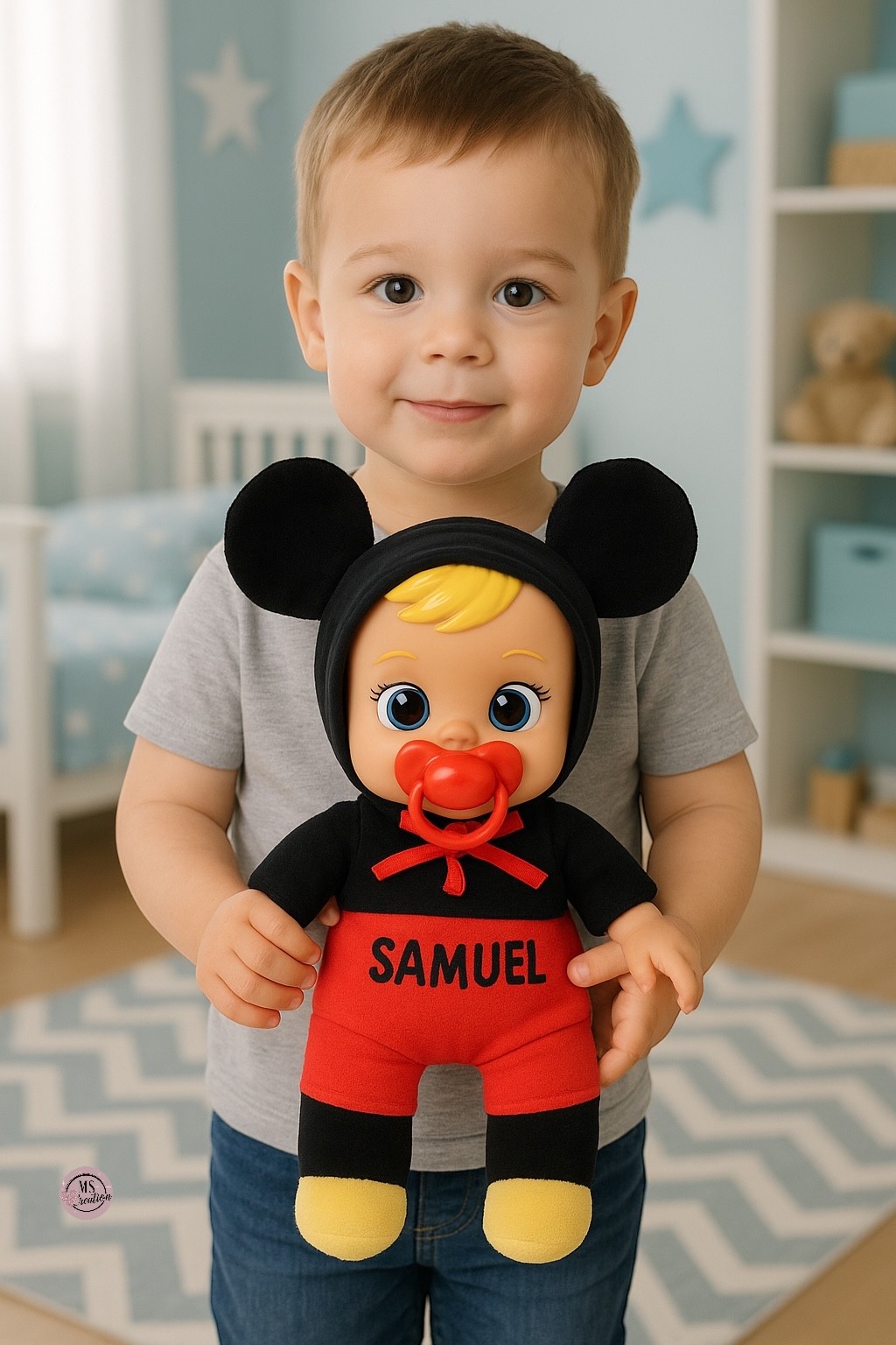 🎄🎁✨ Poupée Mickey Cry Babies – Personnalisée avec Prénom – Idéale Cadeau de Noël 🎅💙 ✨🎁🎄