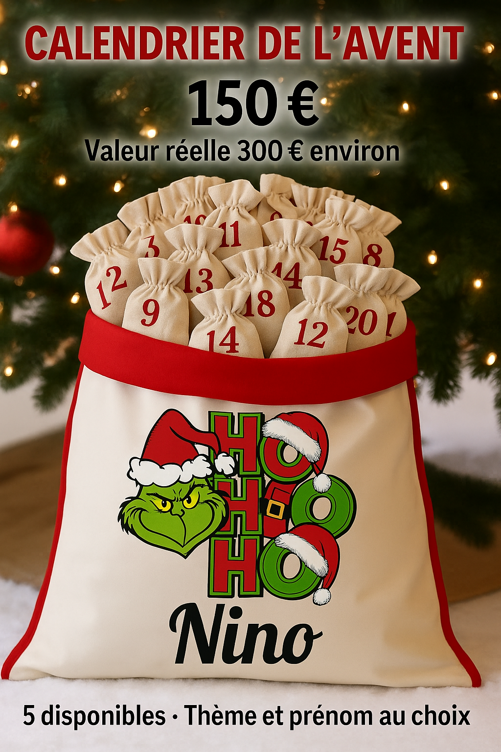 🎄 Le grand sac cadeau personnalisé est décoré selon le thème de votre choix (Grinch, Mickey, ourson, princesse…) et brodé ou imprimé avec le prénom de l’enfant.
