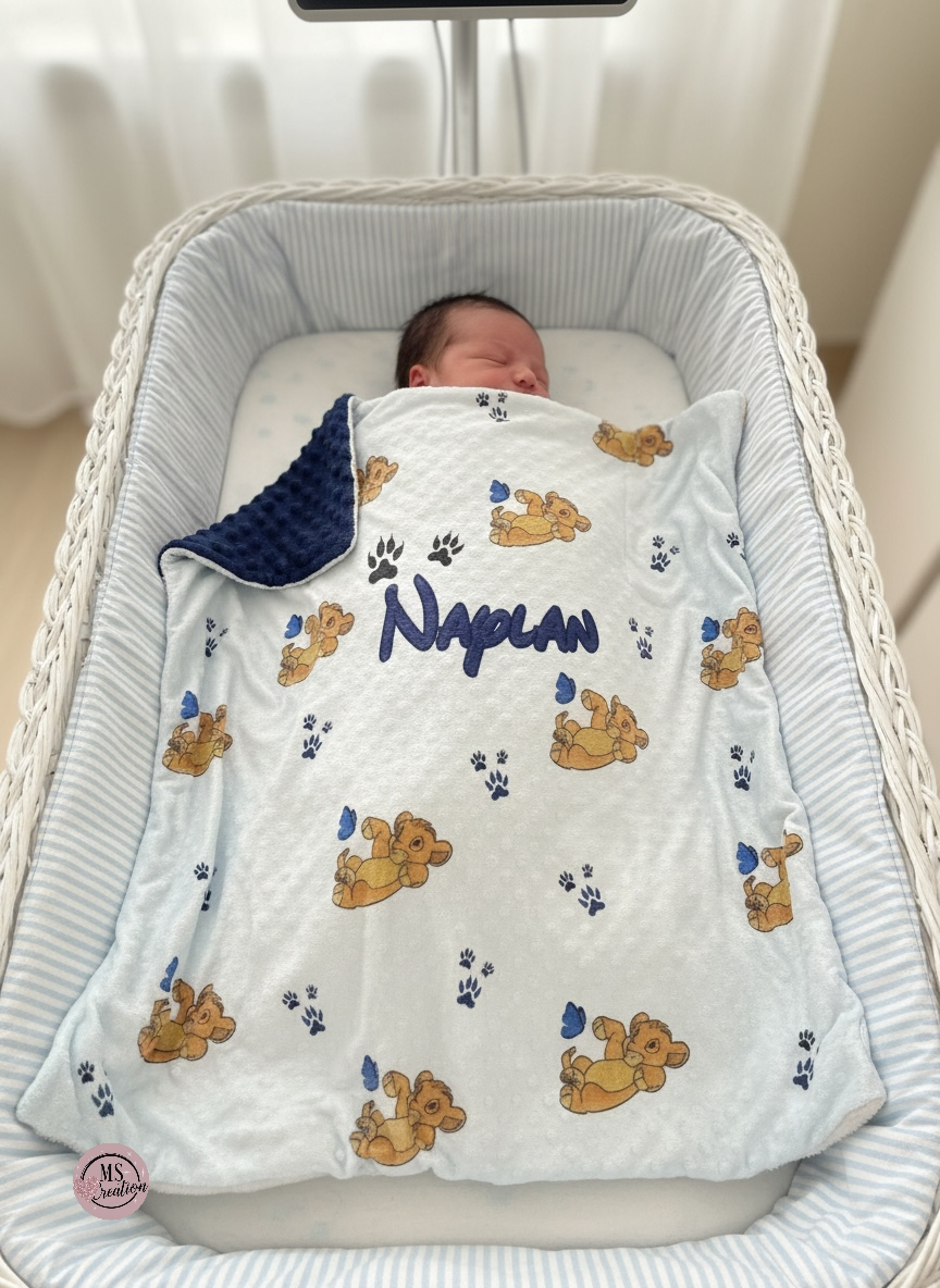 La face avant met en valeur un visuel Simba plein de tendresse (thème Roi Lion), tandis que la face arrière en Minky bleu marine apporte chaleur et douceur. Une pièce de linge de lit bébé personnalisée, parfaite comme cadeau de naissance, de baptême ou d’anniversaire.