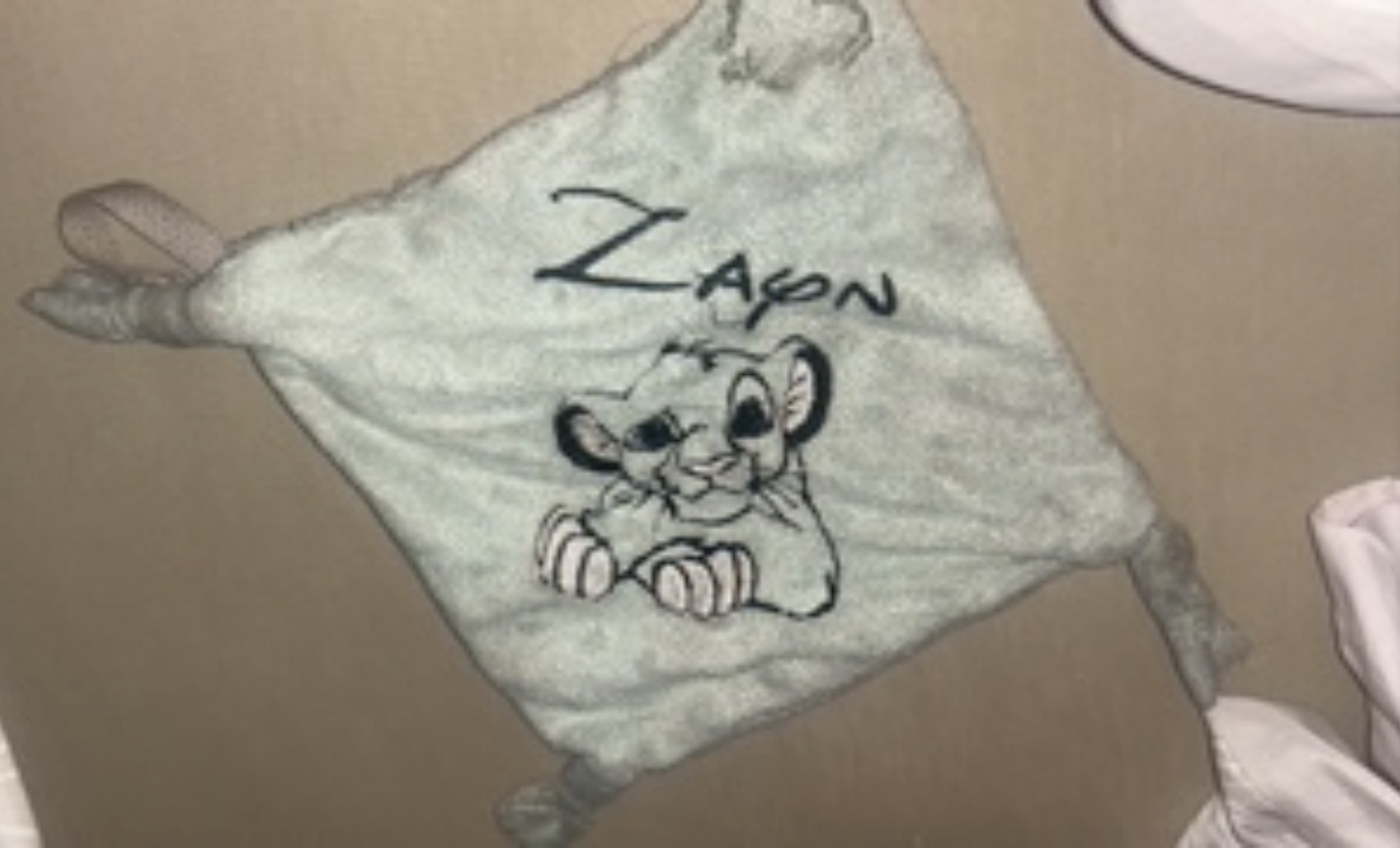 Sur tissu, verre d'eau avec une Broderie, contour noir, Simba et prénom