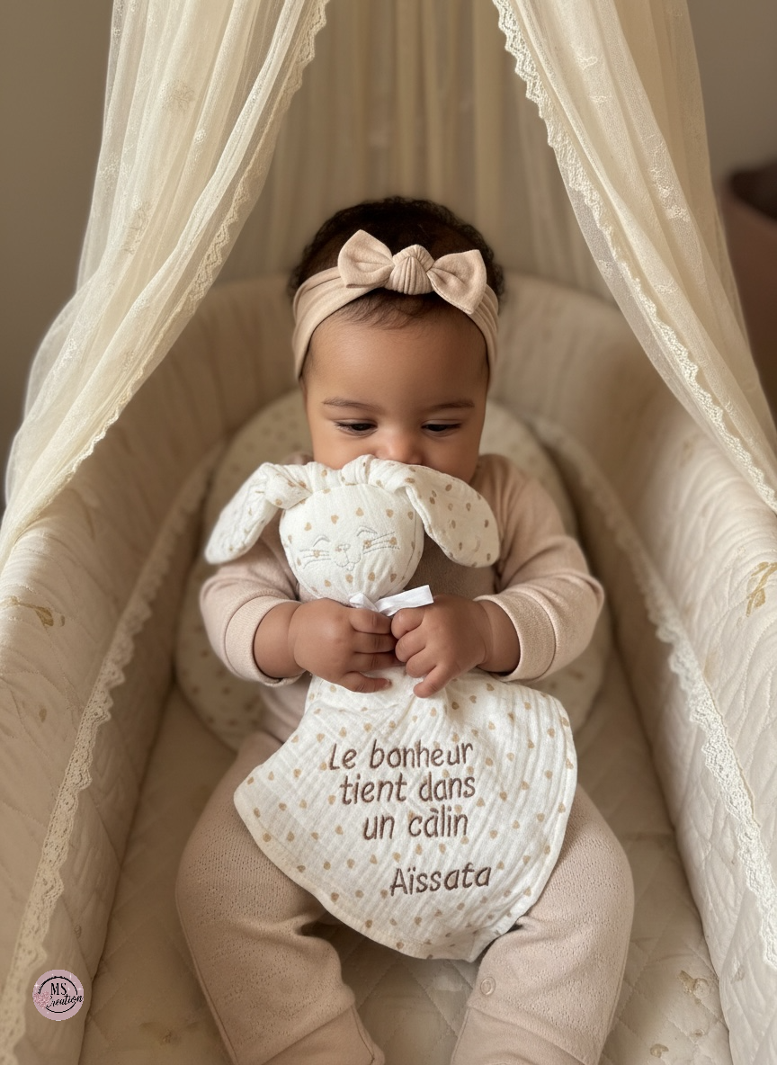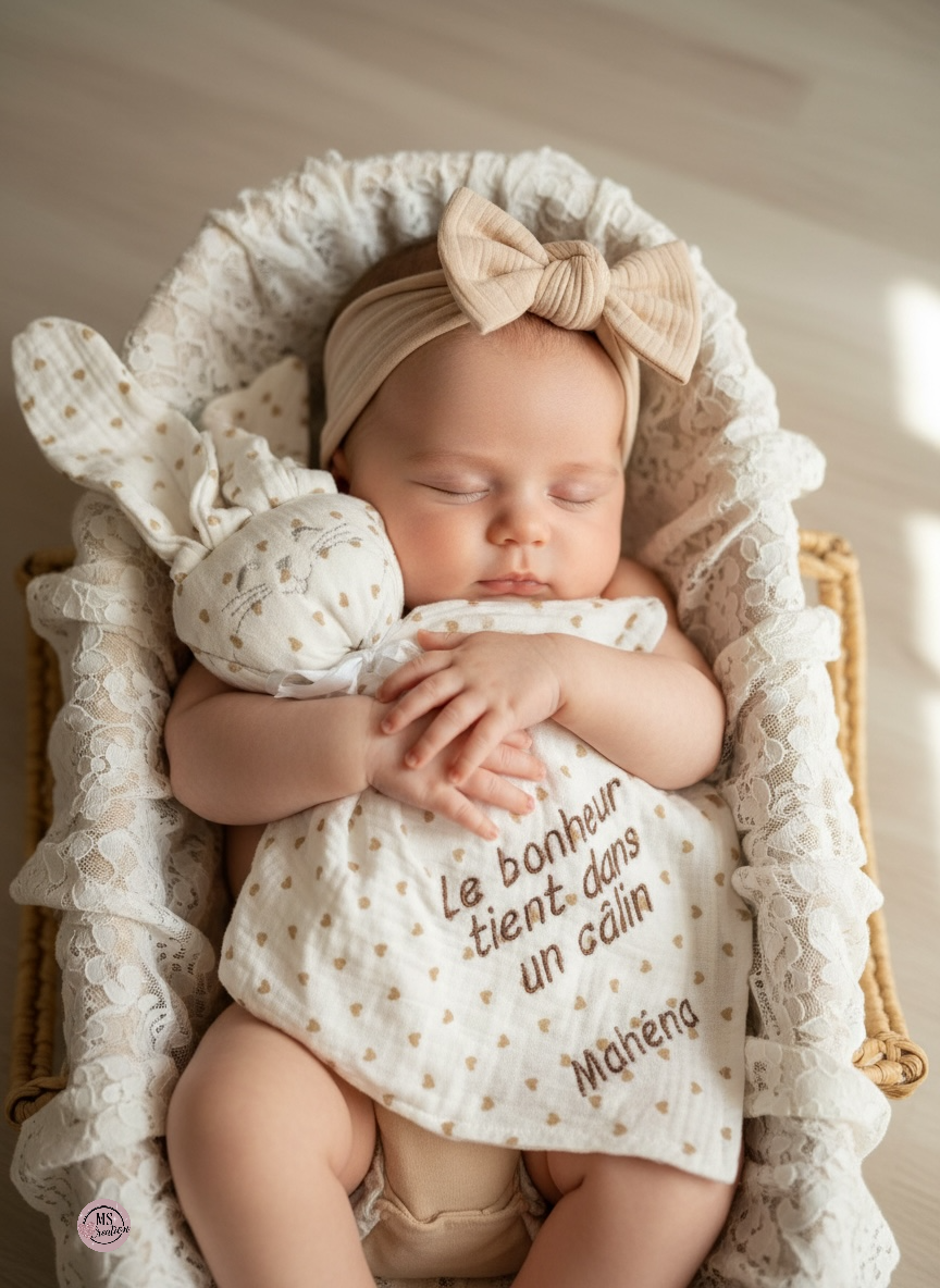 Un doux compagnon à câliner dès les premiers jours – notre doudou lapin cœur beige personnalisé est confectionné avec soin dans notre atelier de broderie artisanale.